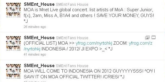 Info perihal kedatangan Super Junior itu berawal dari sebuah akun di fansbase K-Pop di Twitter yakni @SMEnt_House dan @IndonesianELFs yang menyebutkan bahwa gelaran konser Mnet Live Global Concert (MOA) akan digelar di Indonesia.