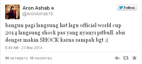 Kapanlagi.com - Lagu anthem Piala Dunia 2014 milik Pitbull, Ole Ola mulai sering muncul di mana-mana. Bagaimana tidak, ajang sepak bola terbesar di dunia itu memang sudah tinggal hitungan hari saja.Nah, saking maraknya, lagu tersebut akhirnya sampai pada telinga penyanyi tanah air berdarah Belanda-Arab, Aaron Ashab. Ia pun tak bisa tinggal diam untuk mengutarakan perasaannya.Menurut Aaron, anthem Piala Dunia milik Pitbull tahun ini sangatlah buruk. Hal itu membuat si penyanyi yang sering melawak ini kehilangan mood-nya di pagi hari.