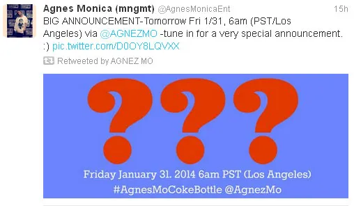 Manajemen Agnes melalui akun twitternya hanya memberikan petunjuk bahwa pada 31 Januari 2014 waktu Amerika akan ada sebuah kejutan spesial. Untuk Indonesia pastinya bisa melihat kejutan ini besok pagi.