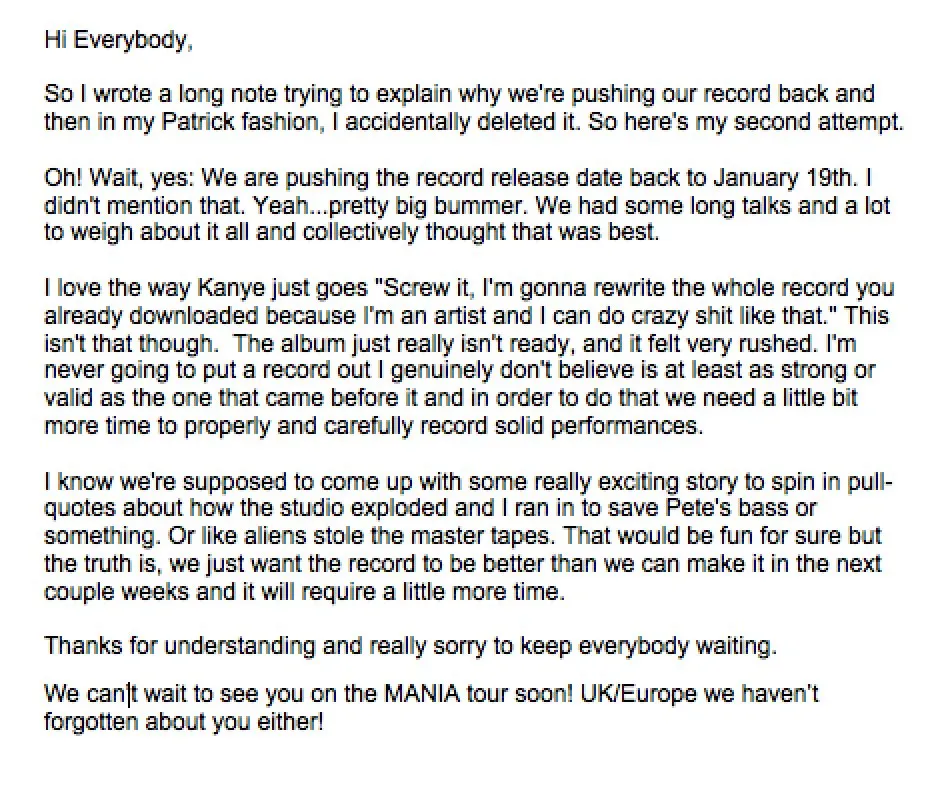 Melalui akun Twitter pribadinya, vokalis Patrick Stump menjelaskan alasan mengapa album itu tertunda. Menurutnya hal ini sudah di pertimbangkan sebelumnya dan menganggap ini adalah pilihan terbaik untuk Fall Out Boy.