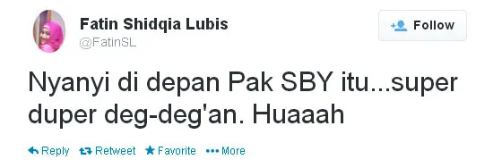 Bagi Fatin ini pertama kalinya di bernyanyi di hadapan SBY. Jangankan Fatin, penyanyi lain mungkin akan mengalami hal yang sama jika bernyanyi di hadapan Presiden.