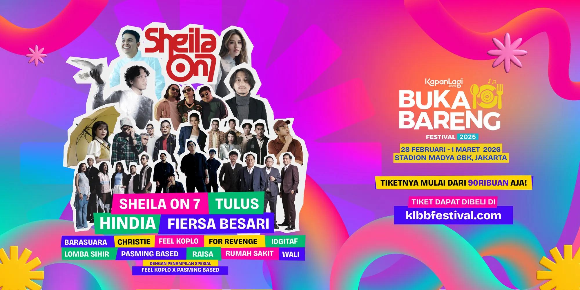 Tahun ini, panggung KLBB Festival 2026 kembali diramaikan musisi Tanah Air lintas genre. Di hari pertama akan ada penampilan Hindia, Fiersa Besari, IDGITAF, Lomba Sihir, Barasuara, For Revenge, dan Christie. Sementara itu, di hari kedua menghadirkan Sheila on 7, Tulus, Raisa, Wali, Rumah Sakit, Feel Koplo, dan Pasming Based.