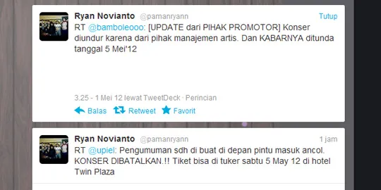 @pamaryann: RT @bamboleooo: [UPDATE dari PIHAK PROMOTOR] Konser diundur karena dari pihak manajemen artis. Dan KABARNYA ditunda tanggal 5 Mei'12