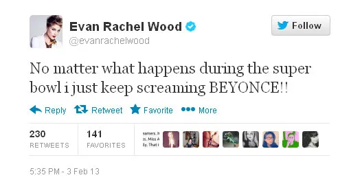 @evanrachelwood: Apapun yang terjadi di Super Bowl, aku terus meneriakkan nama BEYONCE!!