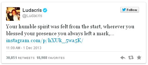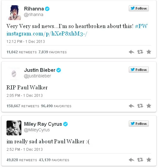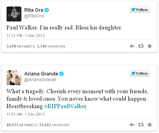 Untaian doa dan ucapan belasungkawa juga datang dari Rihanna, Justin Bieber, Miley Cyrus, Rita Ora dan banyak lagi. Sama dengan Ludacris, mereka masih tidak percaya dengan kematian artis tampan ini.