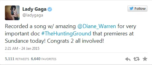 Dilansir dari akun resmi sang artis yang dikutip oleh Digital Spy, Gaga akan merilis lagunya untuk Sundance Festival. Menurutnya, proyek ini sangat penting, dan ia berterima kasih kepada semua pihak yang sudah terlibat di dalamnya.