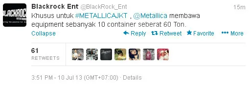 Konser ini dipastikan akan lebih dahsyat dari tahun 1993 lalu. Black Rock Entertainment selaku promotor memberikan bocoran kedahsyatan Metallica di Indonesia nanti. Dia mengatakan bakal ada 10 kontainer gede berisikan peralatan Metallica.