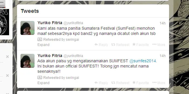 Menurutnya, hal tidak menyenangkan ini terjadi lantaran ada akun palsu yang menamakan Sumfest. Meski begitu, panitia bernama Yuriko Fitria itu meminta maaf kepada Seringai serta band-band yang merasa dirugikan oleh akun palsu tersebut.