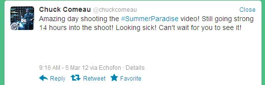 "Amazing day shooting the #SummerParadise video! Still going strong 14 hours into the shoot! Looking sick! Can't wait for you to see it!" ujar Chuck Comeau sang penabuh drum di akun Twitternya.