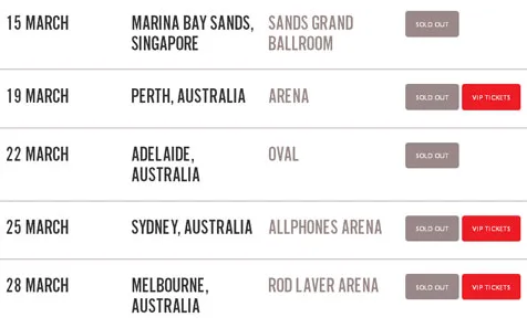 Kabar tersebut diumumkan melalui situs resmi band asal Inggris ini. Dalam gambar tabel yang mereka unggah, terlihat jelas bahwa konser yang digelar pada Sabtu, 15 Maret ini telah ludes, begitu pula dengan tiket konser mereka di beberapa negara lain.